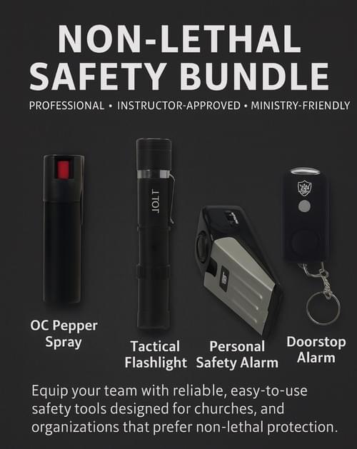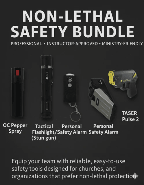 This bundle pairs perfectly with our Lethal vs. Non‑Lethal training course and is ideal for individuals, staff teams, and safety ministries.