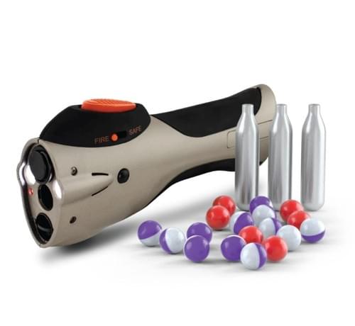 Does not have to hit attackers to be effective. Includes inert projectiles for practice firings. Shell color indicates payload; red live, purple inert. 100% water proof projectiles. Non-flammable.